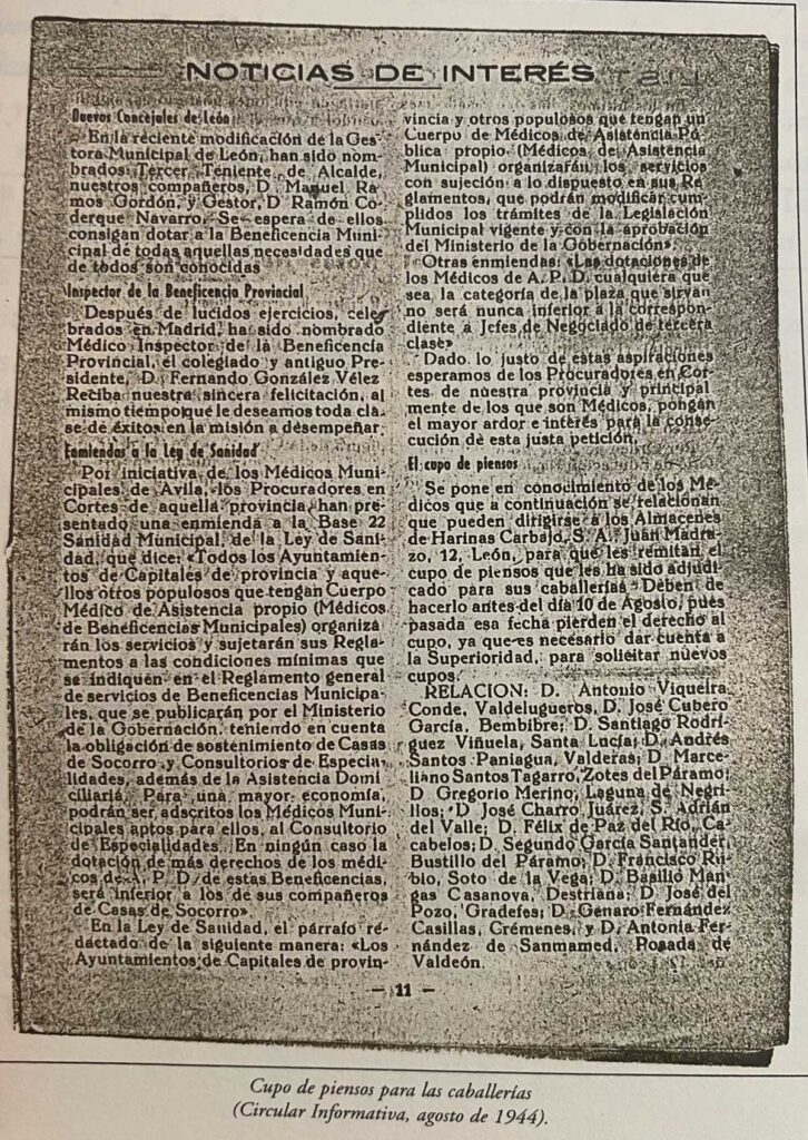 Durante esta etapa se desarrollaron importantes avances sociales y legislativos: en 1942 se implantó el Seguro Obligatorio de Enfermedad, y en 1944 se promulgó la Ley Básica de Sanidad Nacional. En 1947 se instauró el Régimen de Igualas y se comenzaron a construir viviendas para médicos titulares. D. Justo Vega Fernández presidía entonces el Colegio.